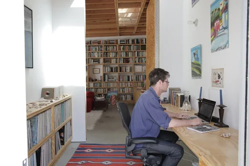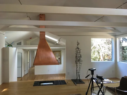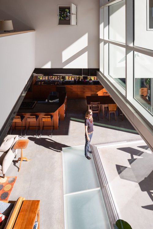 The Robinsons sought a design that was modern and open, that was private in front and open toward the rear yard. They wanted a structural steel frame for its resilience to earthquakes, and the design of the building form takes advantage of steel’s excellent performance in tension. The second floor "crow's nest" cantilevers out over the entry area to make a cover, and more dramatically, the master bedroom is suspended from the roof structure above, and cantilevers out over the sliding glass door dividing the dining area from the covered courtyard.