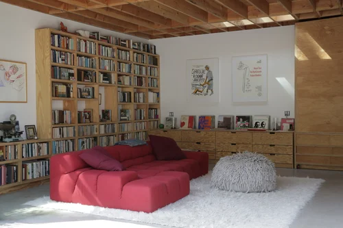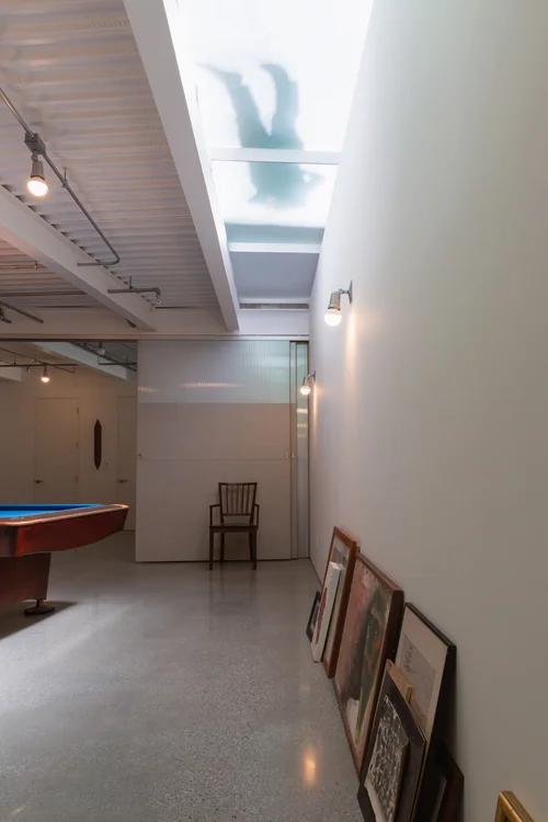 The house’s primary materials are exposed structural steel with cedar ceilings, stucco and curtain wall exterior, and heated concrete floors. The full basement has four light wells and is lit along the south edge by a glass walkway above. Custom cabinetry includes a custom cabinetry jib-door shelf, and a cedar clad entry-tv-fireplace volume. This begins as a genkan entry seat and shoe storage combined and backs up to the family room functions of tv and fireplace